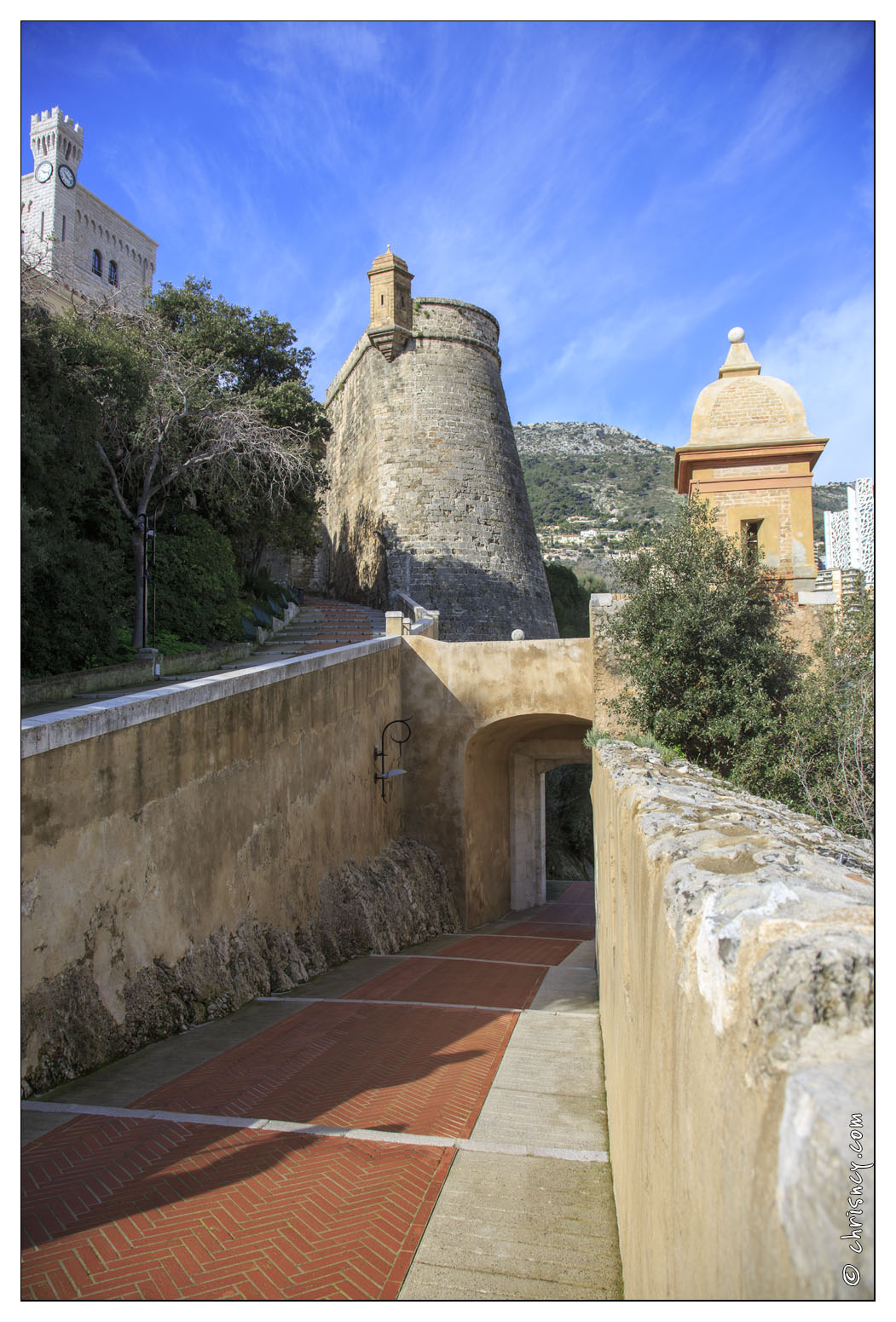 On accède à Monaco-Ville par la Rampe Major, chemin pédestre, pavé de briques rouges, jalonné de deux portes élevées respectivement en 1533 et en 1714